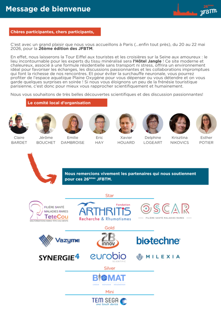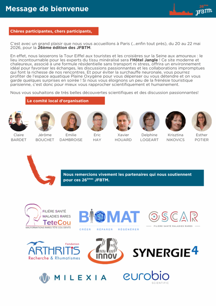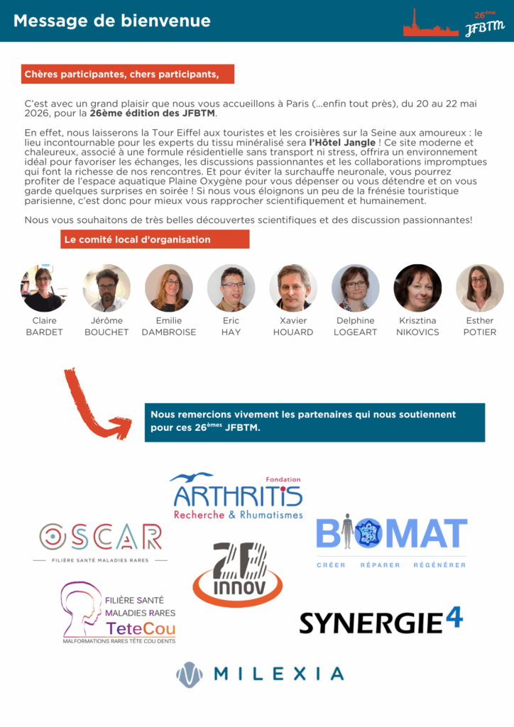 Je suis actuellement en deuxième année de thèse dans le laboratoire du Dr Laurence Legeai-Mallet, sous la supervision du Dr Emilie Dambroise. Dans la continuité de ma thèse et au vu de son avancée et des nouveaux résultats, il nous a paru pertinent de soumettre un abstract au congrès européen ECTS 2023, se déroulant cette année à Liverpool. Mon abstract a été sélectionné pour une présentation orale. En ce sens, le prix des JFBTM a contribué aux frais de déplacement pour Liverpool, me permettant de présenter mes avancées en congrès européen en compagnie du Dr Legeai-Mallet, du Dr Dambroise et d'une ingénieure du laboratoire. Je vous joins une photo de moi en train de présenter, présentation qui s'est très bien passée et qui m'a value des compliments de certains participants dont certains déjà rencontrés l'année dernière lors des JFBTM.